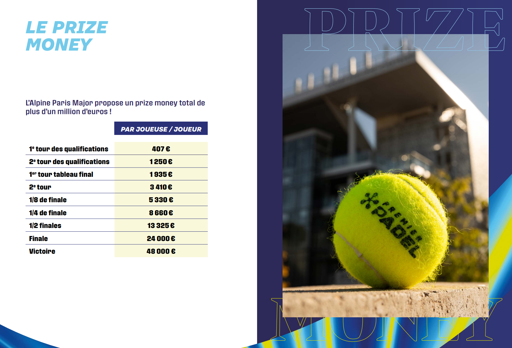 Con oltre un milione di euro distribuiti, l’Alpine Paris Major è uno dei quattro tornei più importanti del calendario Premier Padel. Digita solo i passaggi Maggiore (Doha, Roma, Messico, Parigi) offrono una dotazione di questo tipo, molto più elevata di P1 e P2.